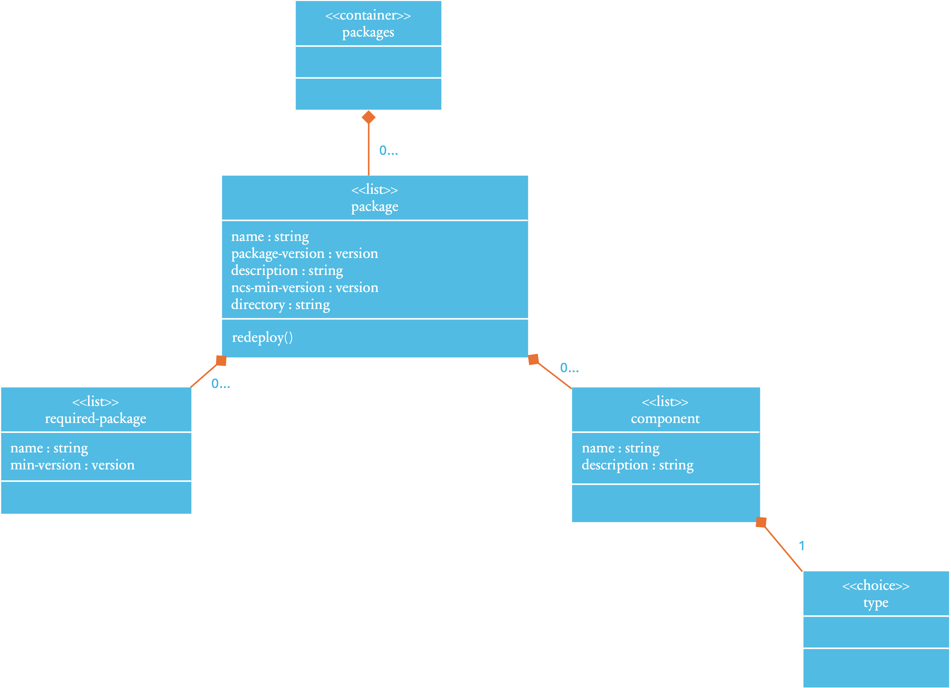 The `package-meta-data.xml` file defines the name of the package, additional settings, and one component. Its settings are defined by the `$NCS_DIR/src/ncs/yang/tailf-ncs-packages.yang` YANG model, where the *package* list name gets renamed to `ncs-package`. See the `tailf-ncs-packages.yang` module where all options are described in more detail. To get an overview, use the IETF RFC 8340-based YANG tree diagram.