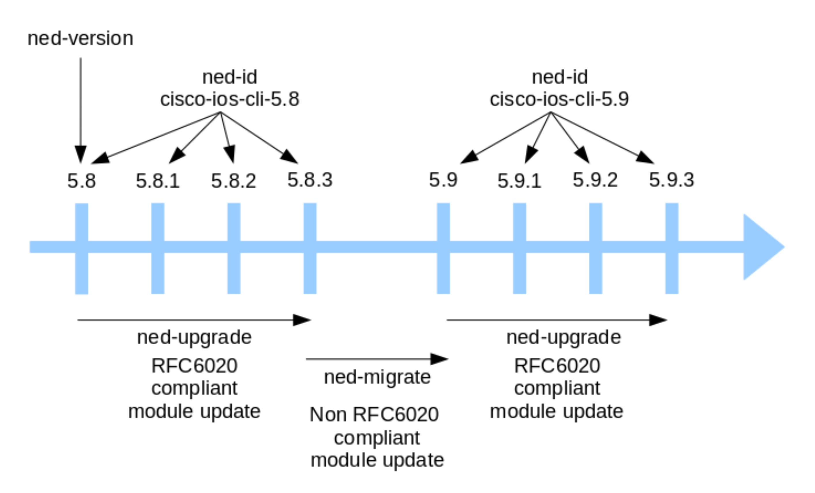 The Cisco NSO NED team ensures that our CLI NEDs, as well as Generic NEDs with Cisco-owned models, have version numbers and NED ID that indicate any possible backward incompatible YANG model changes. When a NED with such an incompatible change is released, the minor digit in the version is always incremented. The case is a bit different for our third-party YANG NEDs since it is up to the end user to select the NED ID to be used. This is further described in [Managing Cisco-provided third-Party YANG NEDs](#sec.managing_thirdparty_neds).