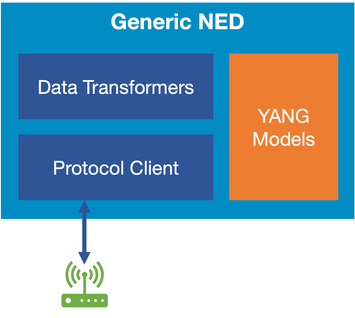 A NED package must provide a device YANG model as well as define means (protocol) to communicate with the device. The latter can either leverage the NSO built-in NETCONF and SNMP support or use a custom implementation. When a package provides custom protocol implementation, typically written in Java, it is called a CLI NED or a Generic NED.