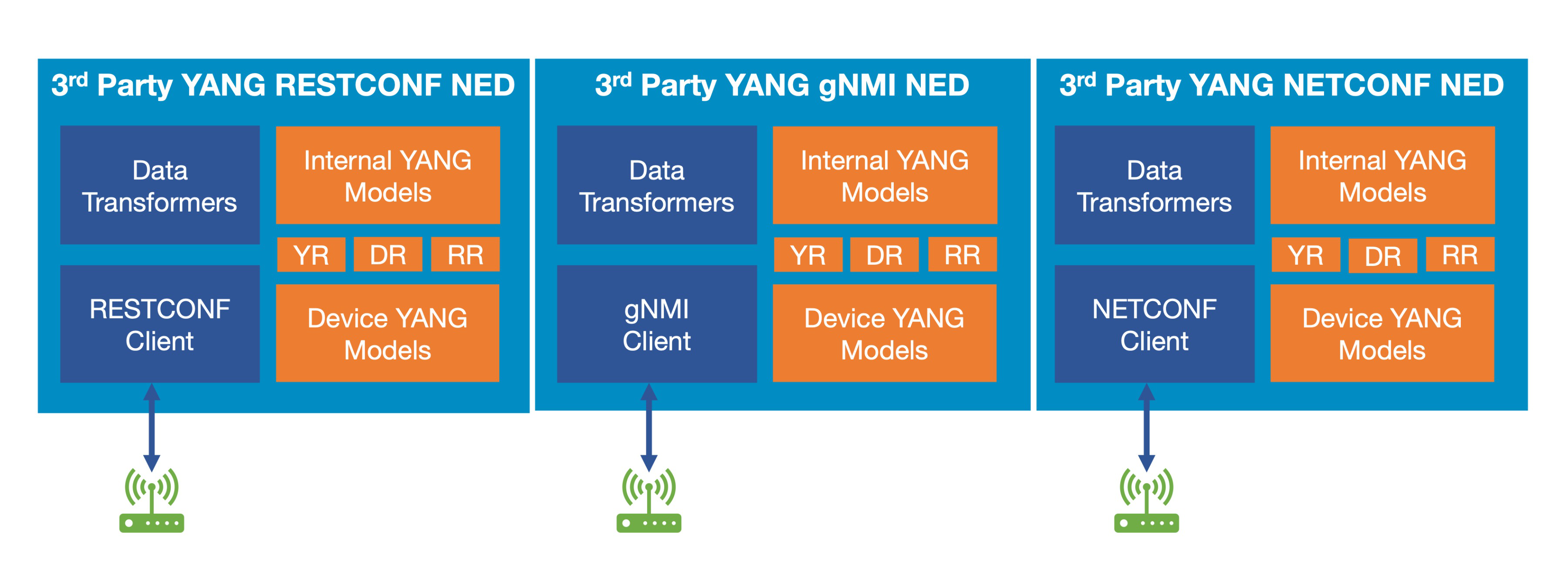 * Targeted for devices supporting model-driven protocols like NETCONF, RESTCONF, and gNMI.