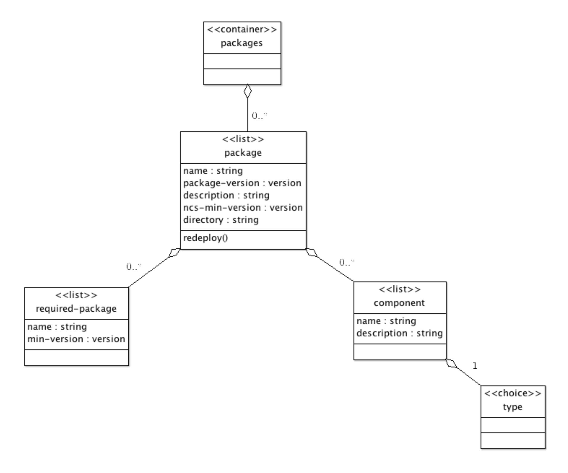 The `package-meta-data.xml` file defines the name of the package, additional settings, and one component. Its settings are defined by the `$NCS_DIR/src/ncs/yang/tailf-ncs-packages.yang` YANG model, where the *package* list name gets renamed to `ncs-package`. See the `tailf-ncs-packages.yang` module where all options are described in more detail. To get an overview, use the IETF RFC 8340-based YANG tree diagram.