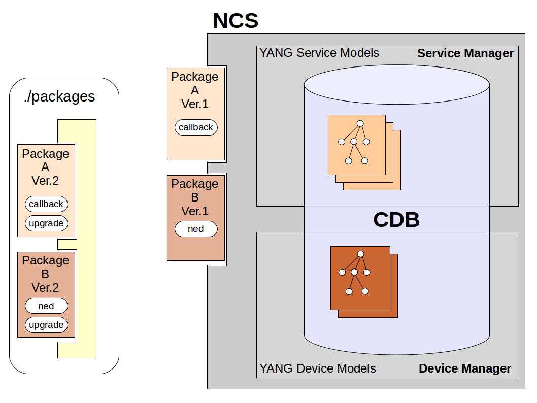 In the 14-upgrade-service example, this more complicated scenario is illustrated with the tunnel package. The tunnel package YANG model maps the vlan\_v2 package one-to-one but is a complete rename of the model containers and all leafs: