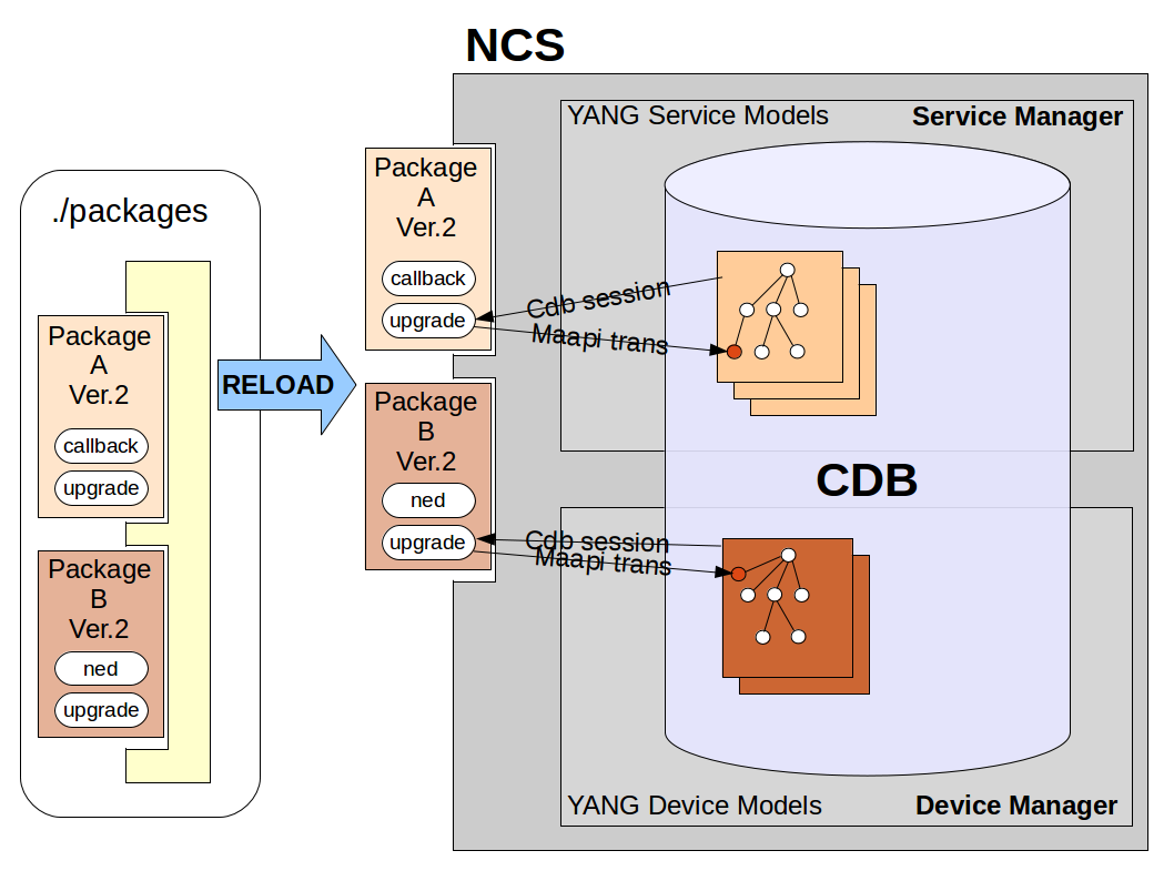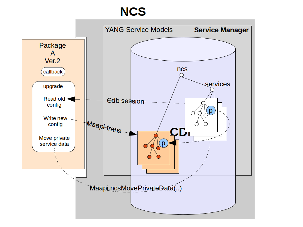 More complicated service package upgrade scenarios occur when a YANG model containing a service point is renamed or moved and augmented to a new place in the NSO model. This is because, not only, does the complete config data set need to be recreated on the new position but a service also has hidden private data that is part of the FASTMAP algorithm and necessary for the service to be valid. For this reason a specific MAAPI method `Maapi.ncsMovePrivateData()` exists that takes both the old and the new positions for the service point and moves the service data between these positions.