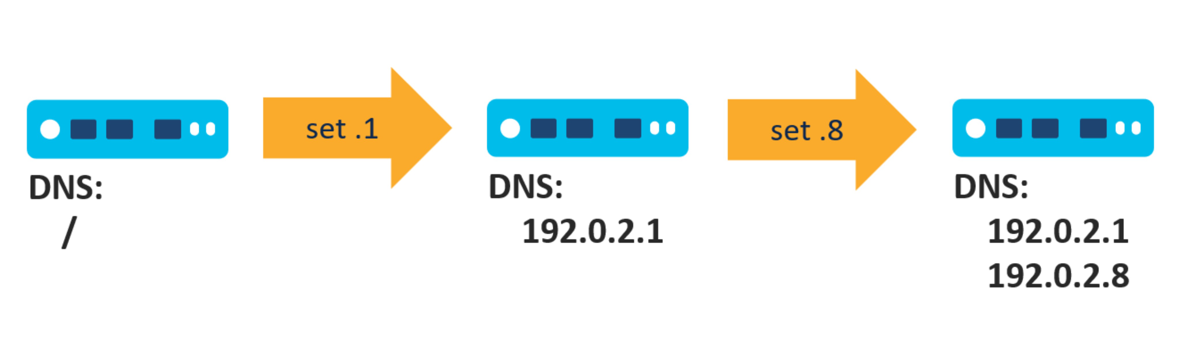 The following figure illustrates this process, where a simple script first configures the IP address 192.0.2.1 (“.1”) as the DNS server, then later configures 192.0.2.8 (“.8”), resulting in a leftover old entry (“.1”).