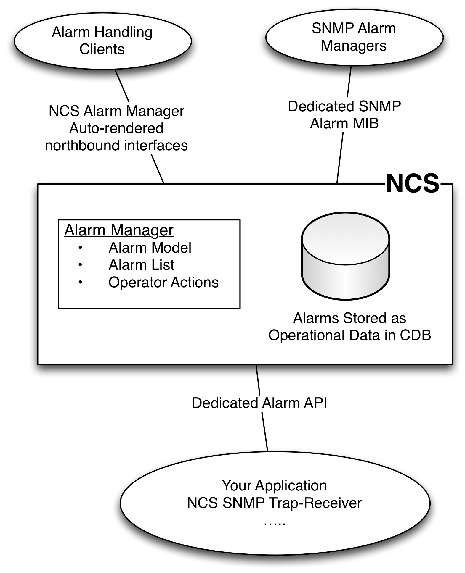 The alarm manager is accessible over all northbound interfaces. A read-only view including an SNMP alarm table and alarm notifications is available in an SNMP Alarm MIB. This MIB is suitable for integration with SNMP-based alarm systems.