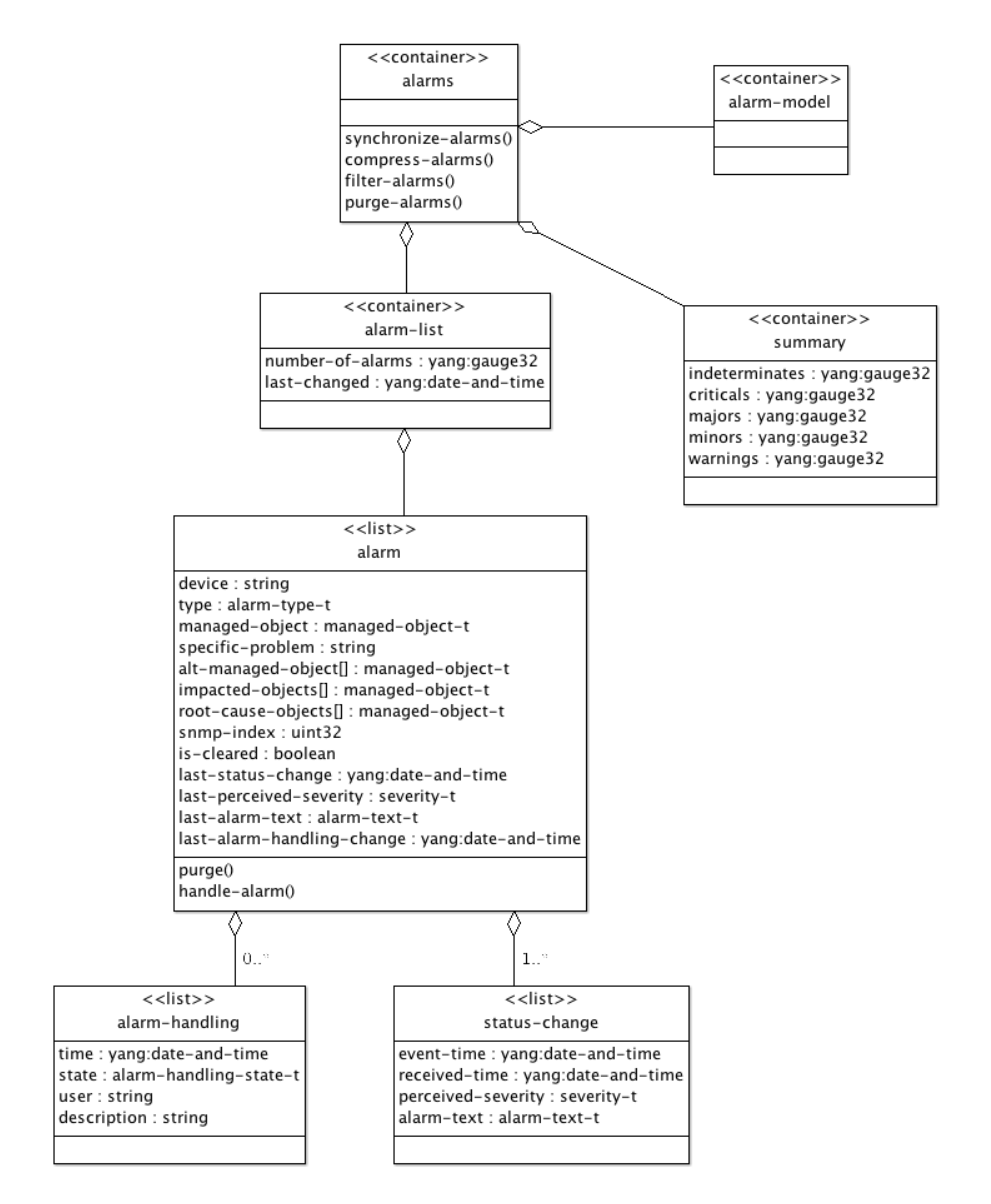 The central part of the YANG Alarm model `tailf-ncs-alarms.yang` has the following structure.