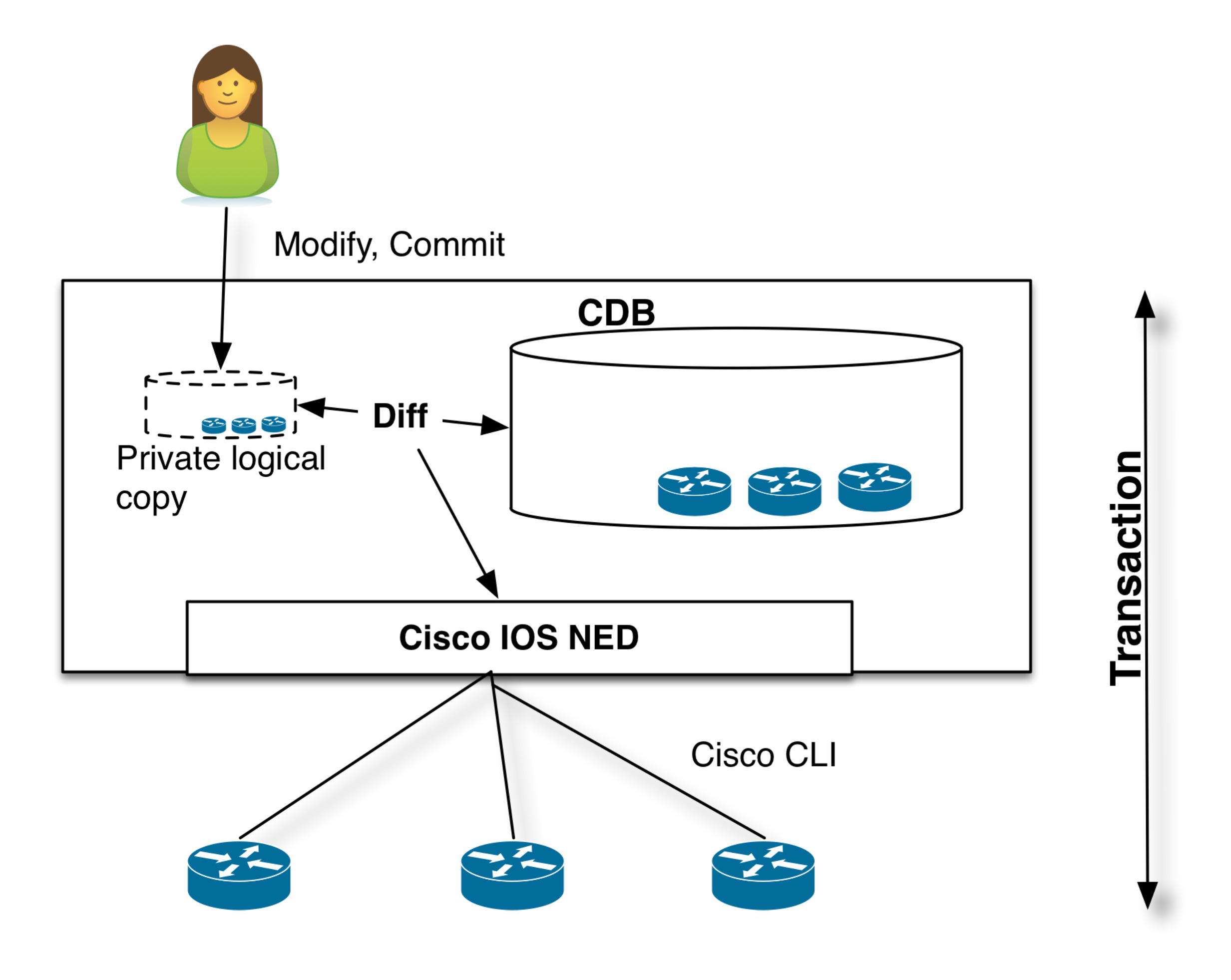 2. The modus operandi when using NSO to perform configuration changes is that the network engineer uses NSO (CLI, WebUI, REST,...) to modify the representation in NSO CDB. The changes are committed to the network as a transaction that includes the actual devices. Only if all changes happen on the actual devices, will it be committed to the NSO data store. The transaction also covers the devices so if any of the devices participating in the transaction fails, NSO will roll back the configuration changes on all modified devices. This works even in the case of devices that do not natively support roll-back like Cisco IOS CLI.