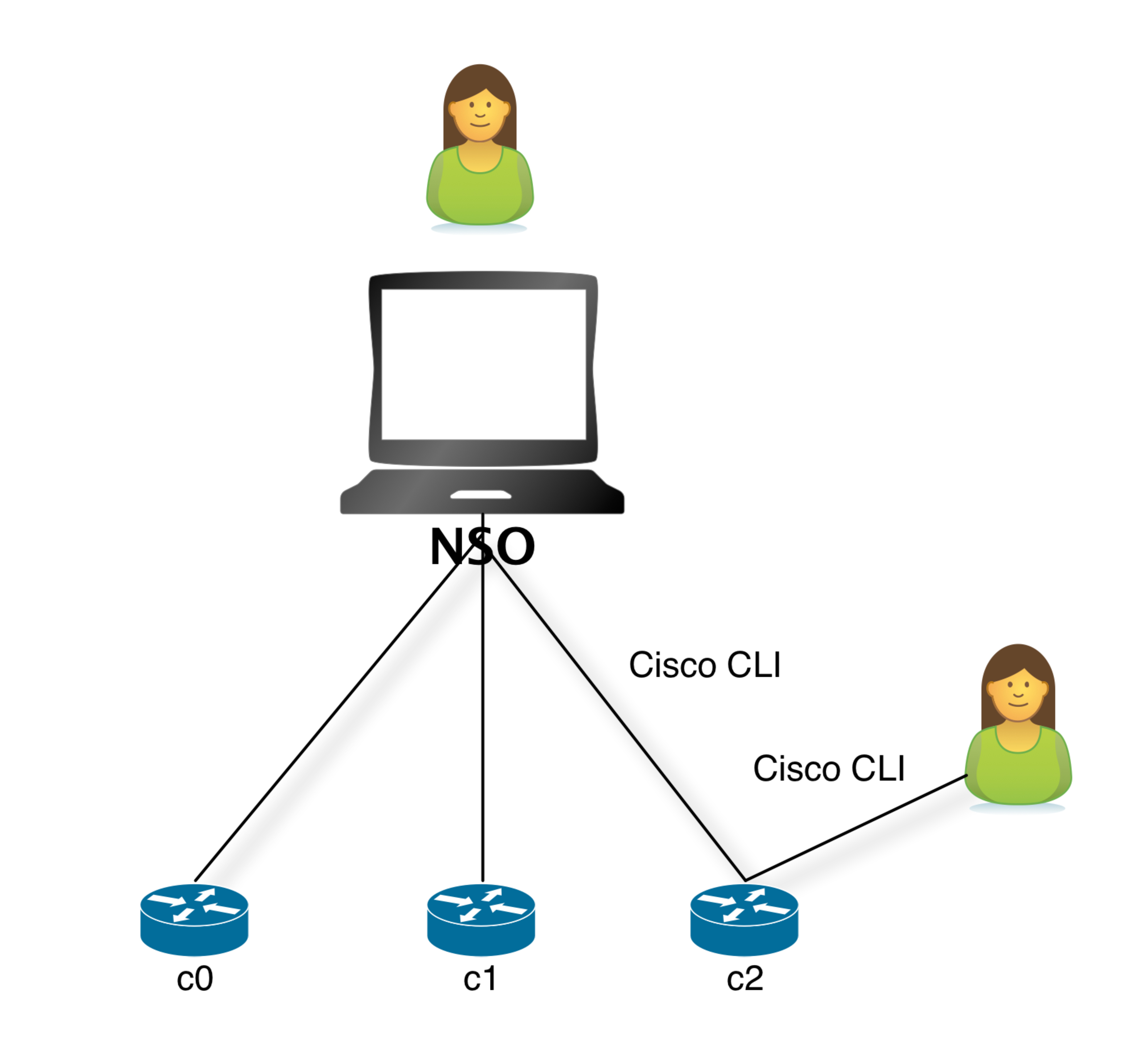 We will use the NSO network simulator to simulate three Cisco IOS routers. NSO will talk Cisco CLI to those devices. You will use the NSO CLI and Web UI to perform the tasks. Sometimes you will use the native Cisco device CLI to inspect configuration or do out-of-band changes.
