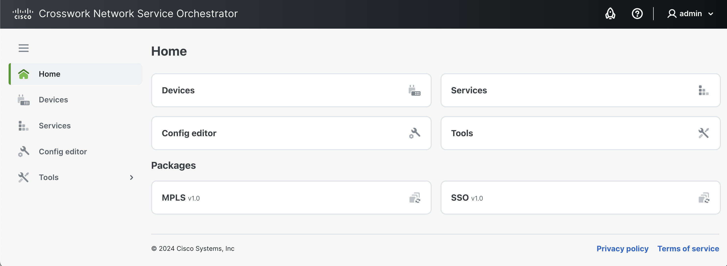 The **Home** view is the default view after logging in. It provides shortcuts to **Devices**, **Services**, **Config editor**, and **Tools**.
