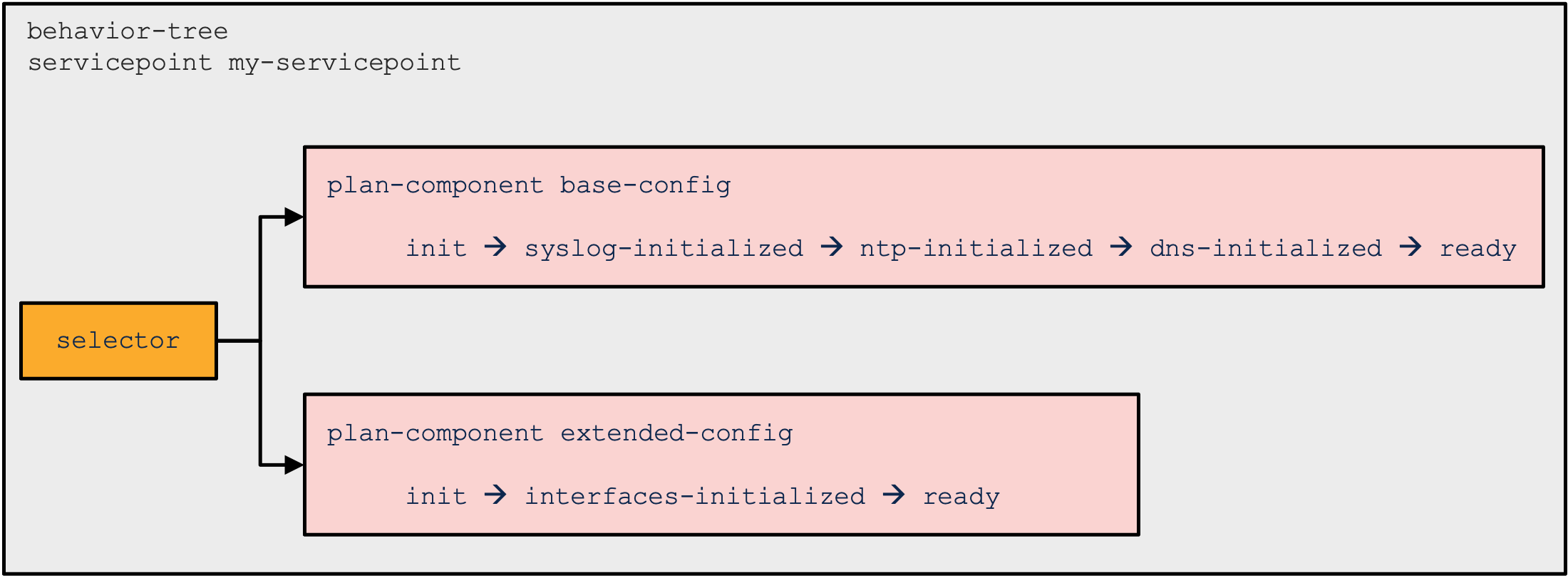 For the service to use it, the plan outline must be linked to a service point with the help of a `behavior tree`. The main purpose of a behavior tree is to allow a service to dynamically instantiate components, based on service parameters. Dynamic instantiation is not always required and the behavior tree for a basic, static, single-component scenario boils down to the following: