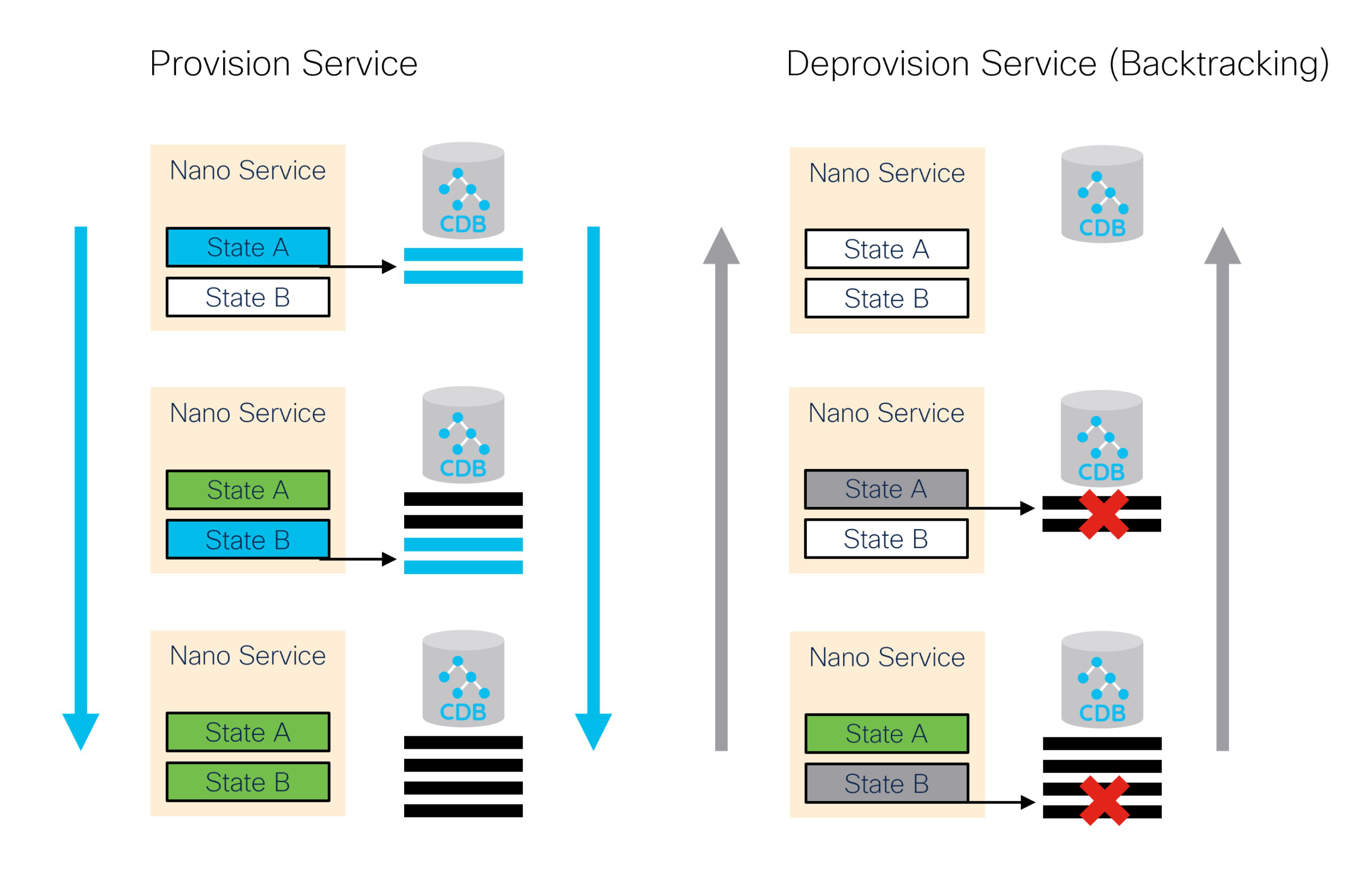 While each step of provisioning happens inside a transaction and is still atomic, the whole service is not. Instead of a simple fully-provisioned or not-provisioned-at-all status, a nano service can be in a number of other *states*, depending on how far in the provisioning process it is.