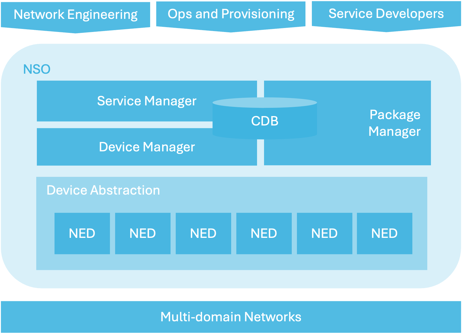 NSO has two main layers, the Device Manager and the Service Manager. They serve different purposes but are tightly integrated with a transactional engine and database.