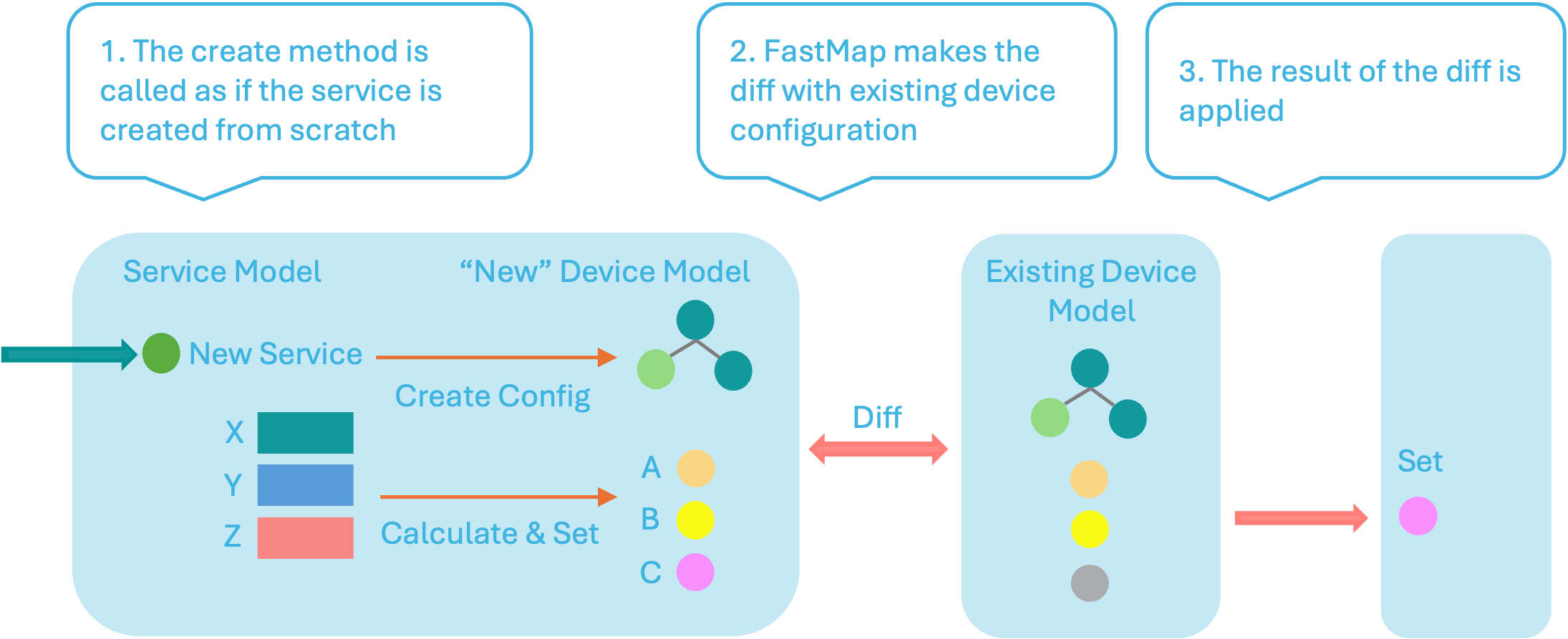 FASTMAP is based on generating changes from an initial 'create'. When the service instance is created the reverse of the resulting device configuration is stored together with the service instance. If an NSO user later changes the service instance, NSO first applies (in a transaction) the reverse diff of the service, effectively undoing the previous results of the service creation code. Then it runs the logic to create the service again and finally executes a diff to the current configuration. This diff is then sent to the devices.